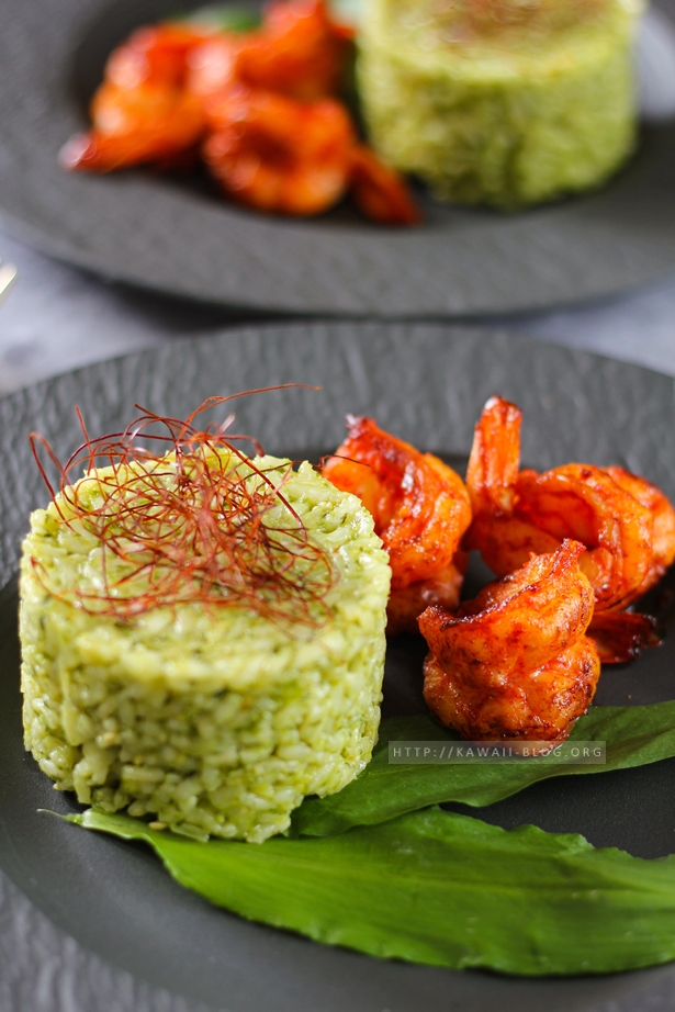 Die küchenfertigen Garnelen mit den genannten Zutaten marinieren und in einer Pfanne mit etwas Öl von allen Seiten scharf anbraten. Die Garnelen mit dem Risotto servieren.