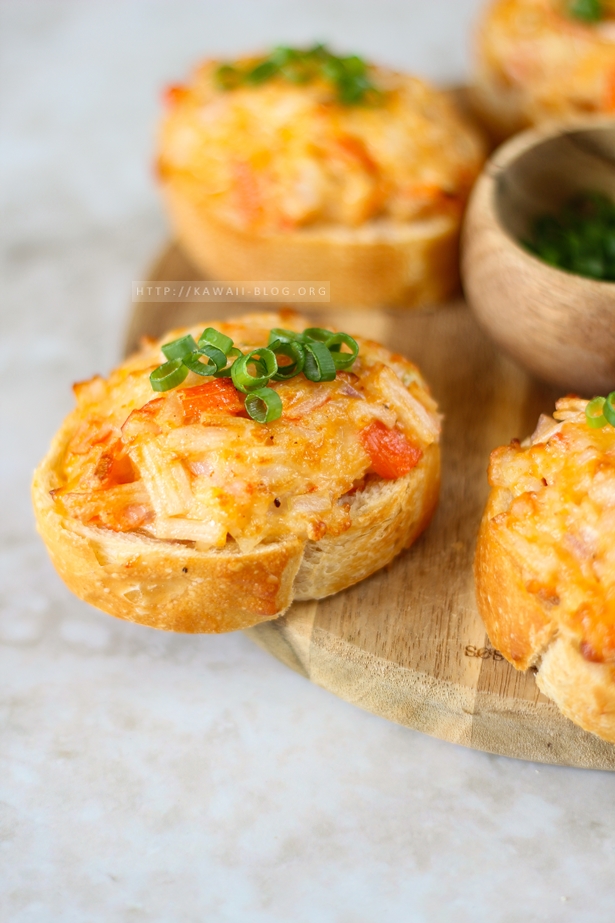 Das Baguette in 2cm dicke Scheiben schneiden. Die Garnelen fein hacken und das Surimi ebenfalls in feine Stücke schneiden. Die beiden Fischsorten mit den restlichen genannten Zutaten vermengen, jeweils einen gehäuften Esslöffel davon auf die Baguette Scheiben geben und glatt streichen. Die Häppchen im Airfryer bei 170°C für 8 Minuten backen, alternativ im Backofen bei 180°C für 10 Minuten. Sobald die Häppchen eine goldgelbe Kruste bekommen haben, sind sie fertig. Nach Geschmack mit Schnittlauch garnieren.