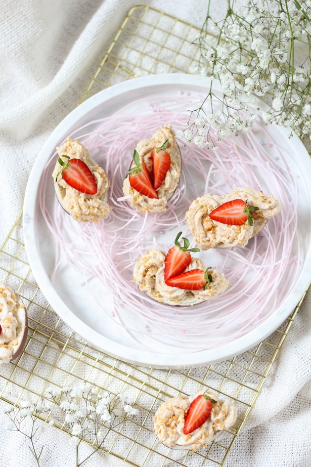 Nun das feste Mousse in einen Spritzbeutel mit großer Sterntülle geben und großzügig auf die Eierhälften spritzen. Das Mousse kann vor dem Servieren noch mit Haselnusskrokant und Erdbeeren dekoriert werden. Im Kühlschrank luftdicht verpackt, bleibt das Dessert 2 Tage haltbar.