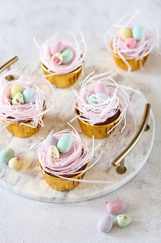 Wie niedlich sind diese Osternester in Pastelltönen geworden? Mir gefallen sie jedenfalls sehr gut. Darunter verbirgt sich ein simpler Brownie, der richtig lecker schokoladig schmeckt. Manchmal sind die einfachen Dinge doch die Besten. Die Zubereitung geht schnell, aber der Effekt ist groß. Die Brownie Muffin Nester sind daher ein perfektes Mitbringsel für den Oster Brunch.