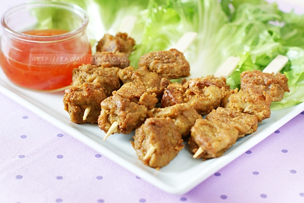 Nun können die Filets aufgespießt und beliebig serviert werden, traditionell wird Klebreis und Erdnusssoße dazu gereicht. Da ich den Erdnussanteil schon in die Marinade eingebaut habe, verzichtete ich auf die Erdnusssoße und nahm stattdessen Chilisoße.