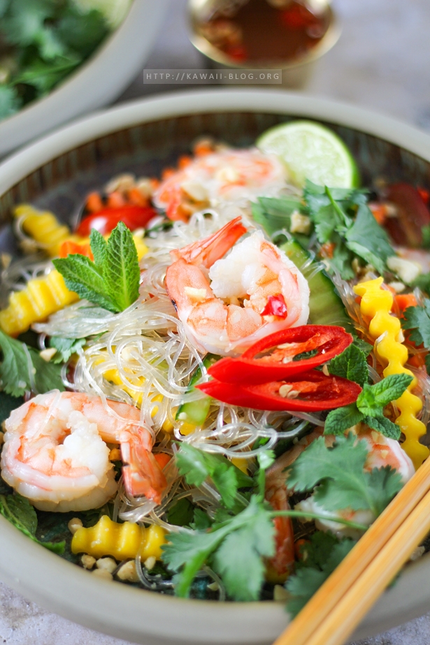 Aufgrund der warmen Temperaturen in den vergangenen Wochen hatte ich Lust auf leichtere Gerichte, die aber dennoch nahrhaft sind. Da kam mir der vietnamesische Glasnudelsalat „Miến Trộn“ in den Sinn. Dieser funktioniert wie einige panasiatische Rezepte nach Baukaustenprinzip, das Protein und Gemüse ist recht flexibel. So habe ich heute noch Datteltomaten in meinen Salat gepackt, weil ich es in dieser Form ‚mal im Restaurant hatte; traditionell gehören Tomaten aber nicht rein.