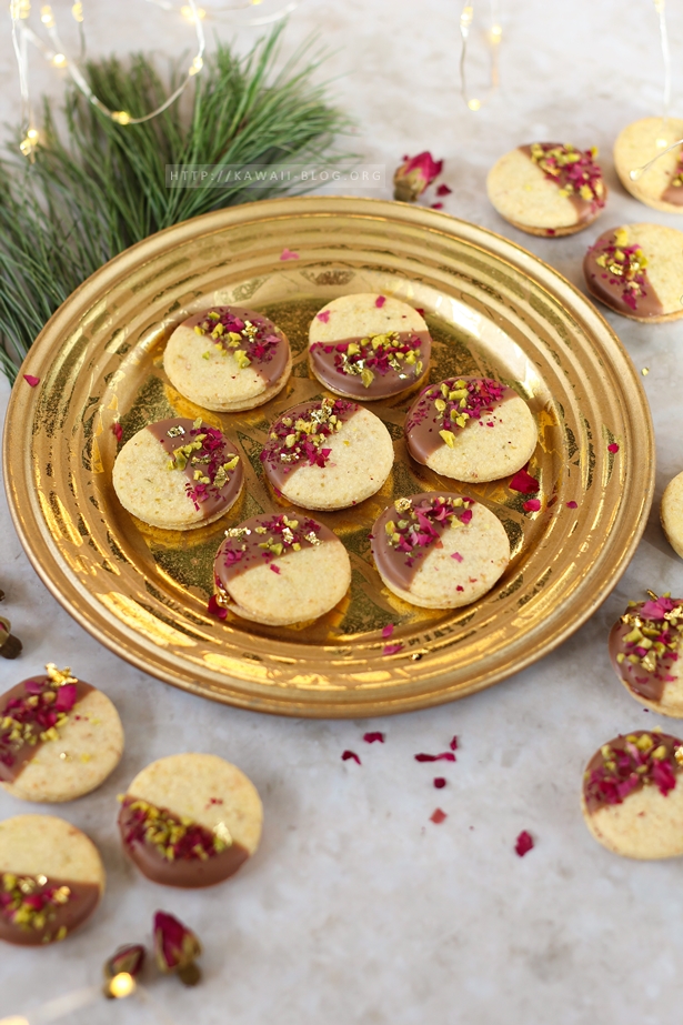 Die Hälfte der Plätzchen mit der Kuchenglasur, Pistazien und Rosenblättern dekorieren.